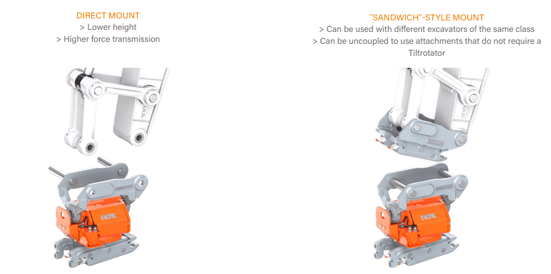 A direct mount setup reduces the overall loss of breakout force, as it keeps the added height to a minimum. Breakout force is the amount of digging power that the machine has when curling the bucket. Any added height by an attachment on the end of the machine dipper incurs a loss of breakout force, therefore directly mounting the tiltrotator means the tiltrotator can use its maximum force.