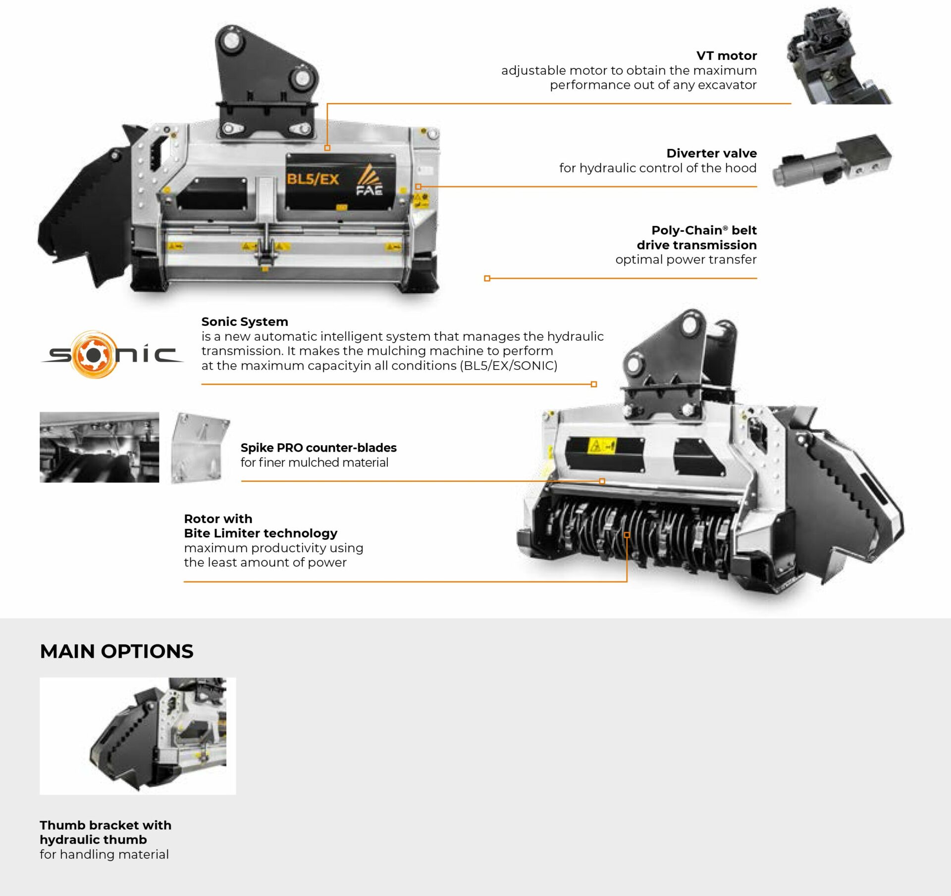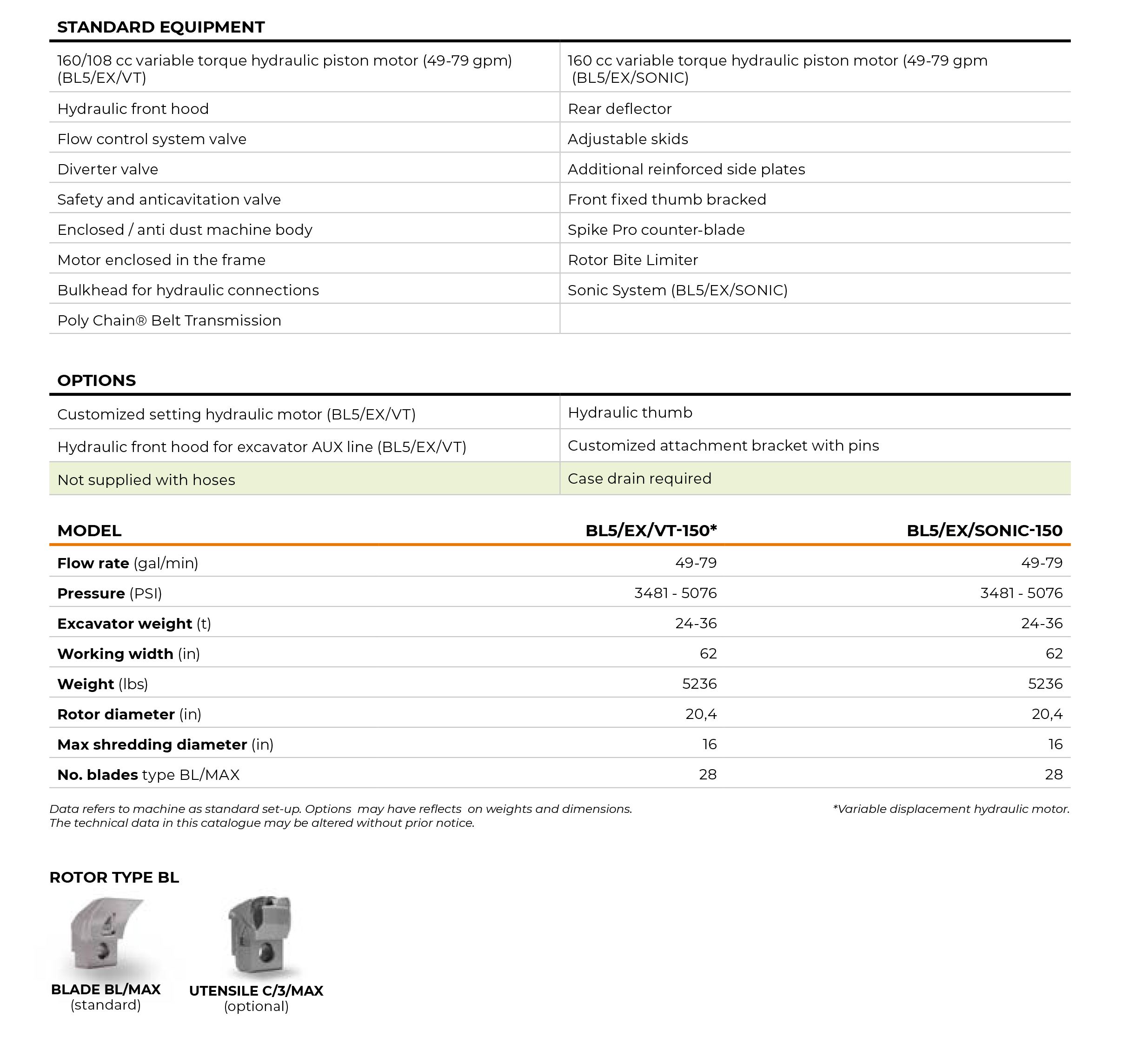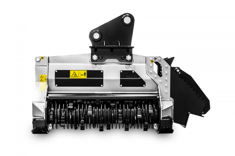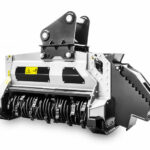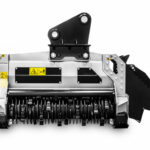 The BL5/EX/VT – BL5/EX/SONIC for 24-36 ton excavators, mulches vegetation up to 16″ in diameter and has a working width of 62″. This head is ideal for handling and removing vegetation in wooded areas, especially when a large shredding capacity and fast operational speed is required. The rotor with Bite Limiter technology comes with special wear-resistant steel limiters that limit the teeth’s reach. This cuts down on power demand, promotes a consistent working speed, optimizes fuel consumption and ensures excellent performance when mulching any kind of wood.