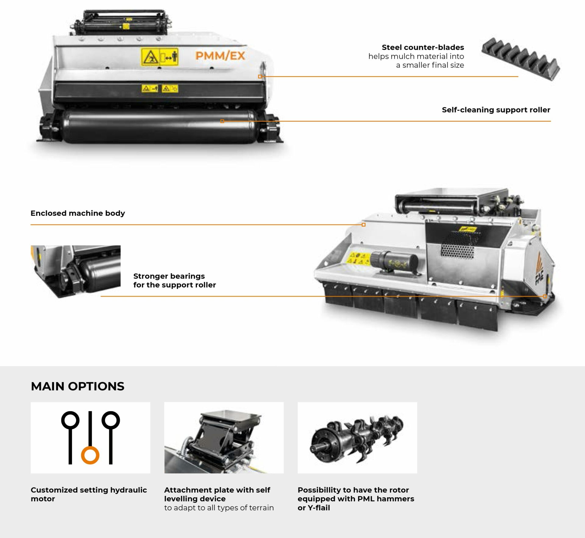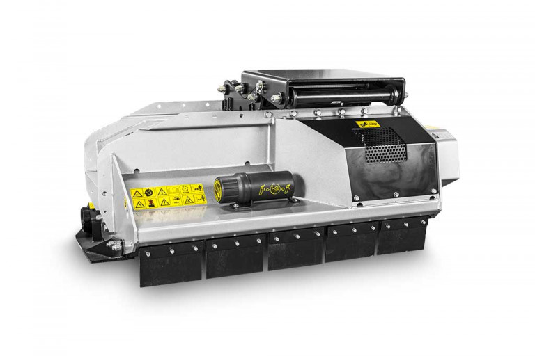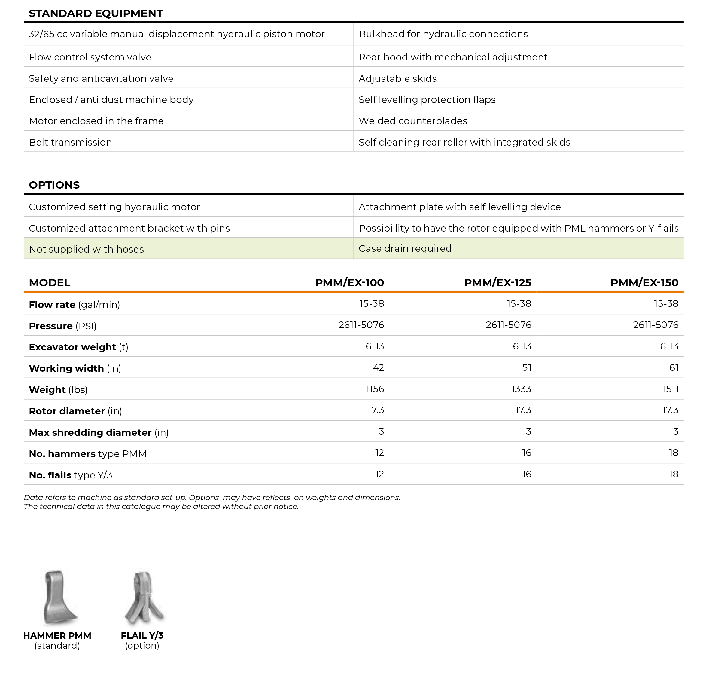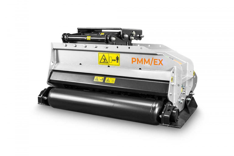 The PMM/EX is a flail mower used to mulch underbrush, grass and bushes. It is equipped with a variable manual displacement hydraulic piston motor that can be set to the carrier’s hydraulic specifications. The stronger roller supports (optional) ensure the best performance and maximum reliability on difficult terrain. The flow control valve ensures minimal setup of the mulcher without adjustments or modifications to the hydraulic system of the excavator.
