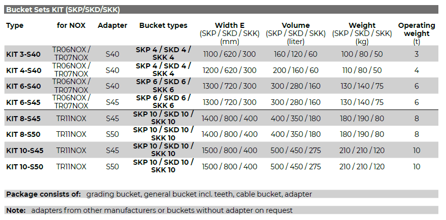 Standard tiltrotator buckets come in a kit consisting of a grading bucket, digging bucket and cable/trench bucket. These buckets are designed specifically for use with tiltrotators due to their low self weight and robustness. The Scandanavian standard S Lock or S Type system provides a standardized system across all tiltrotators from S40 up to S70. This setup vastly reduces the tiltrotator overall build height and helps with the loss of breakout force.