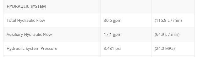 For this example we will use a Takeuchi TB240. Here you can find the specs on the TB240. Under “Hydraulic System” we can find that the Auxiliary Hydraulic Flow is 17.1GPM or 64.9LPM.